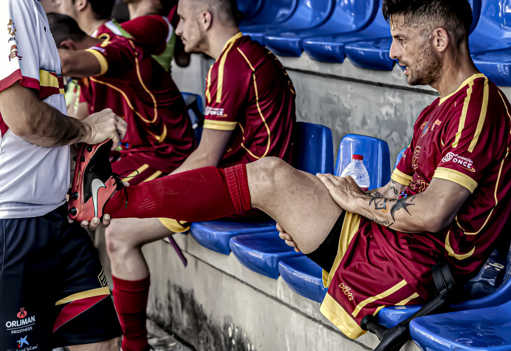 UN JUGADOR DE FUTBOL ADAPTADO DE LA SELECCION ESPAÑOLA, ES AYUDADO POR UN MASAJISTA, DESPUES DE QUE SUFRIERA UN PINZAMIENTO MUSCULAR EN EL GEMELO, DE LA UNICA PIERNA HABIL QUE DISPONE.